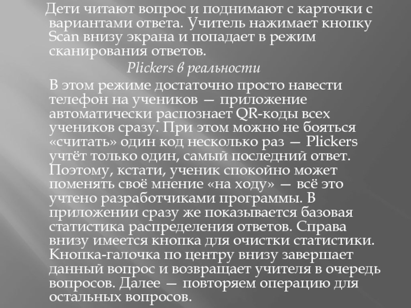 В этом режиме достаточно просто навести телефон на учеников — приложение автоматически распознает QR-коды всех учеников сразу. При этом можно не бояться «считать» один код несколько раз — Plickers учтёт только один, самый последний ответ. Поэтому, кстати, ученик спокойно может поменять своё мнение «на ходу» — всё это учтено разработчиками программы. В приложении сразу же показывается базовая статистика распределения ответов. Справа внизу имеется кнопка для очистки статистики. Кнопка-галочка по центру внизу завершает данный вопрос и возвращает учителя в очередь вопросов. Далее — повторяем операцию для остальных вопросов.