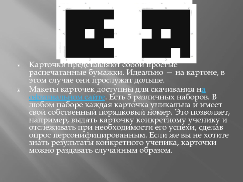 Макеты карточек доступны для скачивания на официальном сайте. Есть 5 различных наборов. В любом наборе каждая карточка уникальна и имеет свой собственный порядковый номер. Это позволяет, например, выдать карточку конкретному ученику и отслеживать при необходимости его успехи, сделав опрос персонифицированным. Если же вы не хотите знать результаты конкретного ученика, карточки можно раздавать случайным образом.