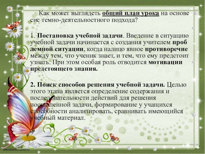 1. Постановка учебной задачи. Введение в ситуацию учебной задачи начинается с создания учителем проб лемной ситуации, когда налицо явное противоречие между тем, что ученик знает, и тем, что ему предстоит узнать. При этом особая роль отводится мотивации предстоящего знания.