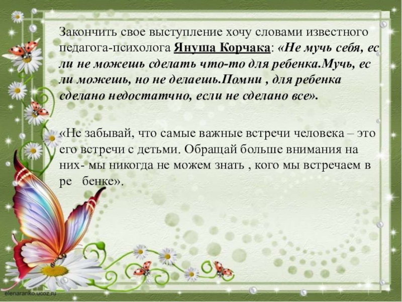 Закончить свое выступление хочу словами известного педагога-психолога Януша Корчака: «Не мучь