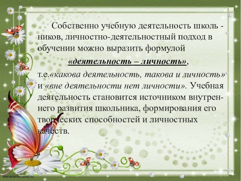 т.е.«какова деятельность, такова и личность» и «вне деятельности нет личности». Учебная деятельность становится источником внутрен- него развития школьника, формирования его творческих способностей и личностных качеств.