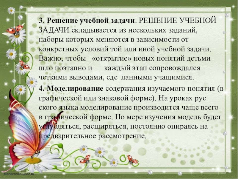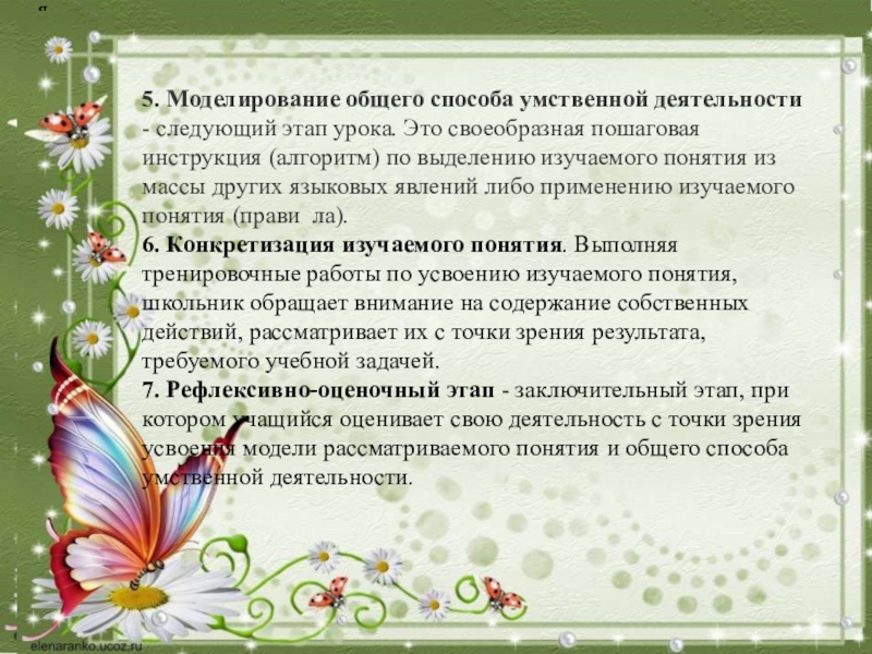 5. Моделирование общего способа умственной деятельности - следующий этап урока. Это своеобразная пошаговая инструкция (алгоритм) по выделению изучаемого понятия из массы других языковых явлений либо применению изучаемого понятия (прави ла).