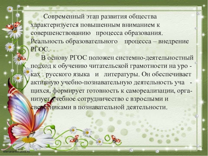 В основу РГОС положен системно-деятельностный подход к обучению читательской грамотности на уро - ках русского языка и литературы. Он обеспечивает активную учебно-познавательную деятельность уча -щихся, формирует готовность к самореализации, орга- низует учебное сотрудничество с взрослыми и сверстниками в познавательной деятельности.