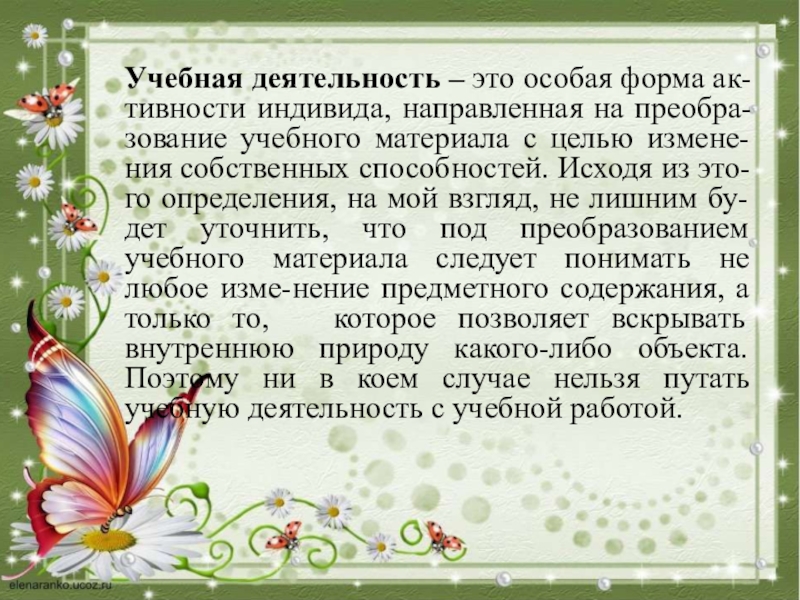 зование учебного материала с целью измене- ния собственных способностей. Исходя из это-го определения, на мой взгляд, не лишним бу- дет уточнить, что под преобразованием учебного материала следует понимать не любое изме-нение предметного содержания, а только то, которое позволяет вскрывать внутреннюю природу какого-либо объекта. Поэтому ни в коем случае нельзя путать учебную деятельность с учебной работой.