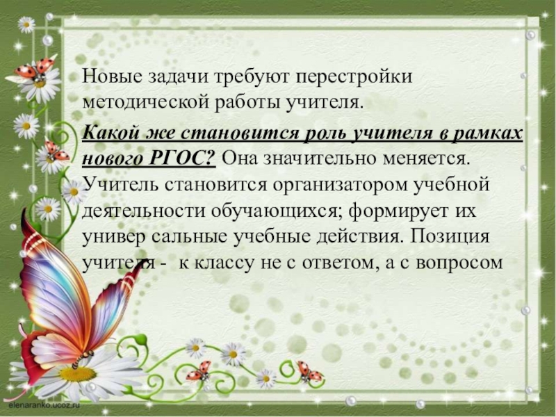 учителя в рамках нового РГОС? Она значительно меняется. Учитель становится организатором учебной деятельности обучающихся; формирует их универ сальные учебные действия. Позиция учителя - к классу не с ответом, а с вопросом