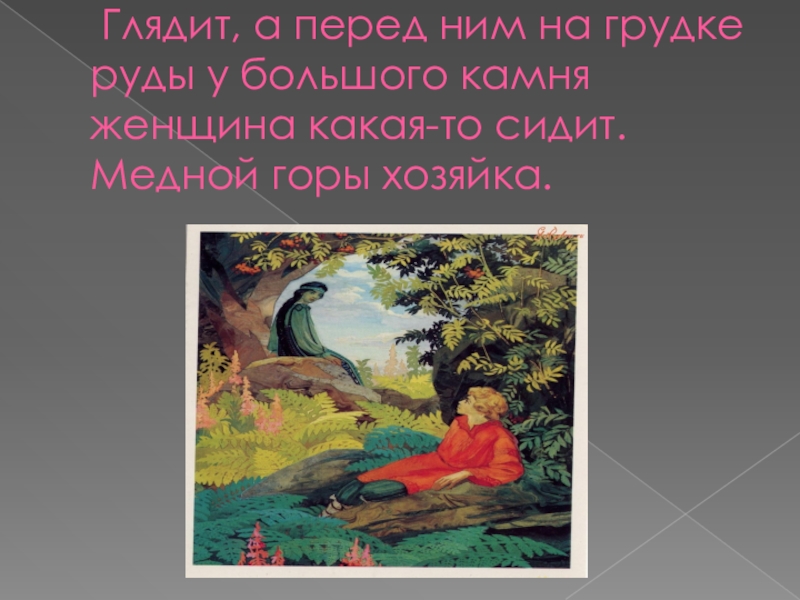 Глядит, а перед ним на грудке руды у большого камня женщина какая-то сидит. Медной горы хозяйка.