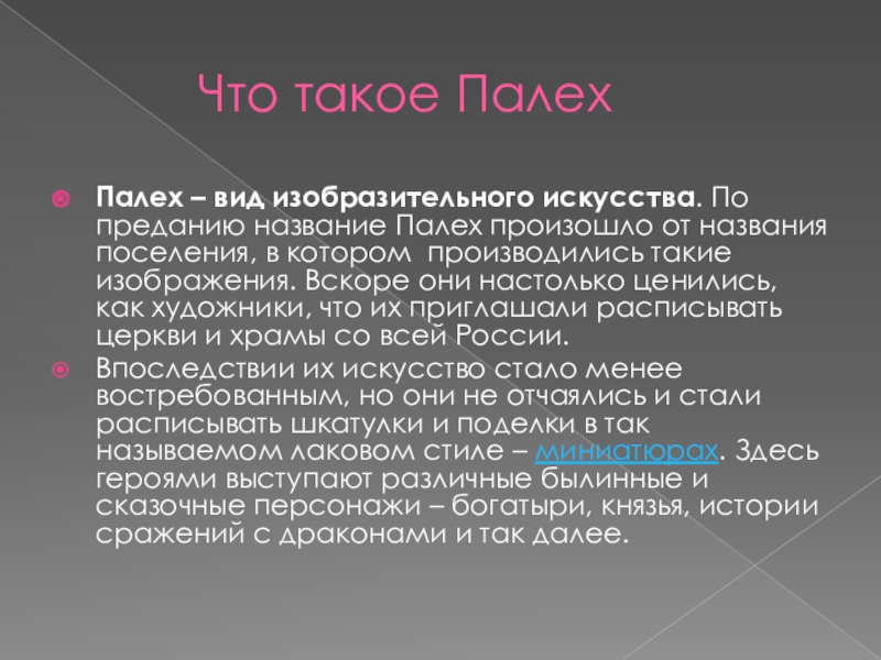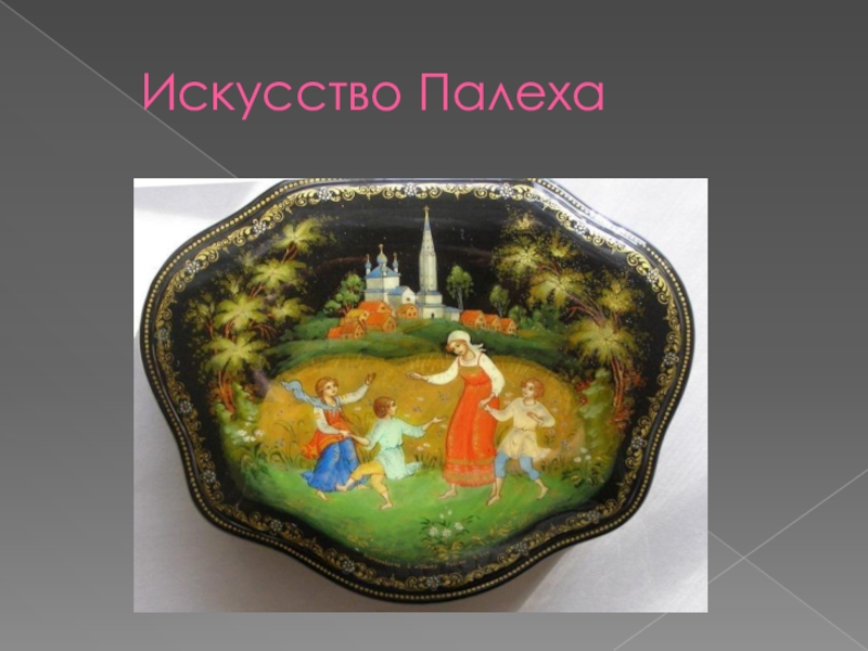 Что такое ПалехПалех – вид изобразительного искусства. По преданию название Палех произошло от названия поселения, в котором  производились такие изображения. Вскоре они настолько ценились, как художники, что их приглашали расписывать церкви и
