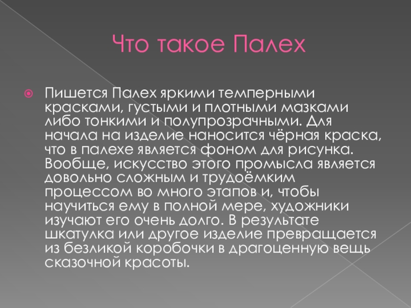 красками, густыми и плотными мазками либо тонкими и полупрозрачными. Для начала на изделие наносится чёрная краска, что в палехе является фоном для рисунка. Вообще, искусство этого промысла является довольно сложным и трудоёмким процессом во много этапов и, чтобы научиться ему в полной мере, художники изучают его очень долго. В результате шкатулка или другое изделие превращается из безликой коробочки в драгоценную вещь сказочной красоты.