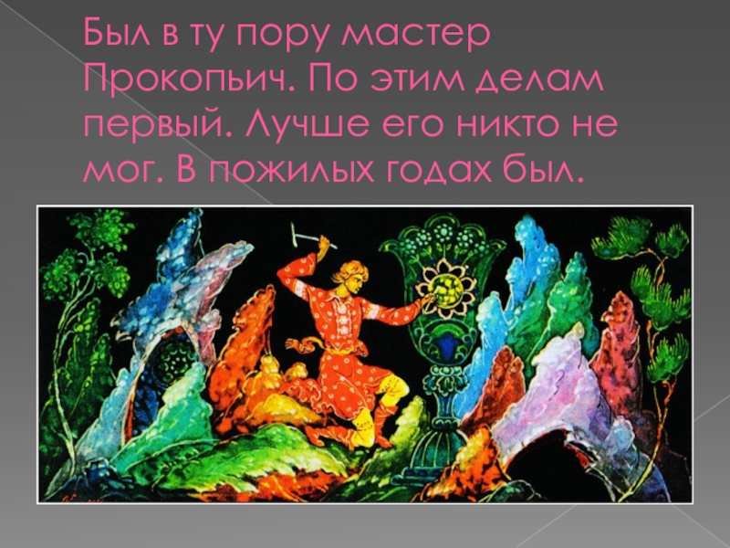 Слайд 8Был в ту пору мастер Прокопьич. По этим делам первый. Лучше