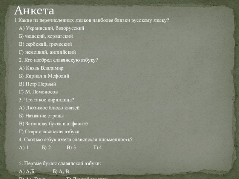 Цель работы: познакомиться с историей возникновения письменности на Руси, ее создателями, выявить степень знаний респондентов об истории русского языка.