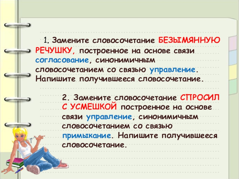 2. Замените словосочетание СПРОСИЛ С УСМЕШКОЙ построенное на основе связи управление, синонимичным словосочетанием со связью примыкание. Напишите получившееся словосочетание.