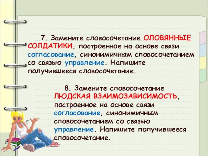 8. Замените словосочетание ЛЮДСКАЯ ВЗАИМОЗАВИСИМОСТЬ, построенное на основе связи согласование, синонимичным словосочетанием со связью управление. Напишите получившееся словосочетание.