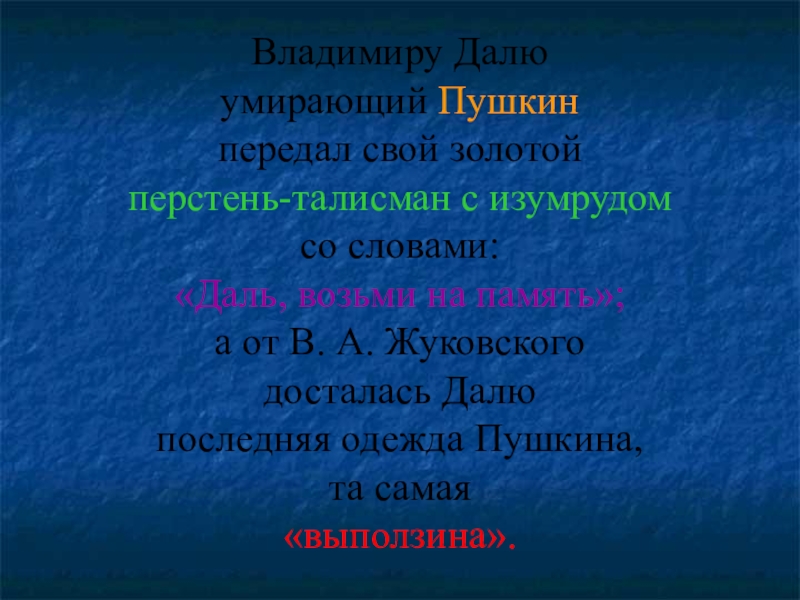 неизвестное ему слово «выползина» — шкурка, которую после зимы сбрасывают ужи и змеи, выползая из неё. Зайдя как-то к Далю
