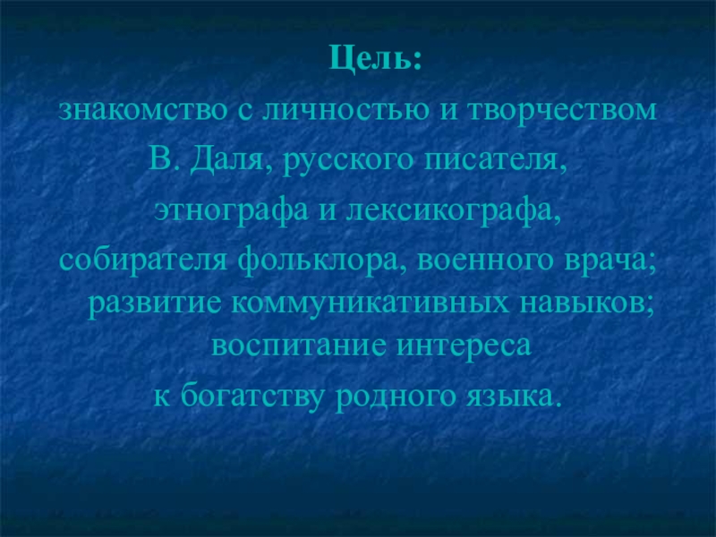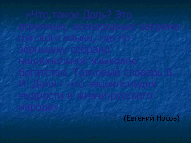 языка, где по зёрнышку собрано национальное языковое богатство. Толковый словарь В.И. Даля – это энциклопедия мудрости и жизни русского народа».