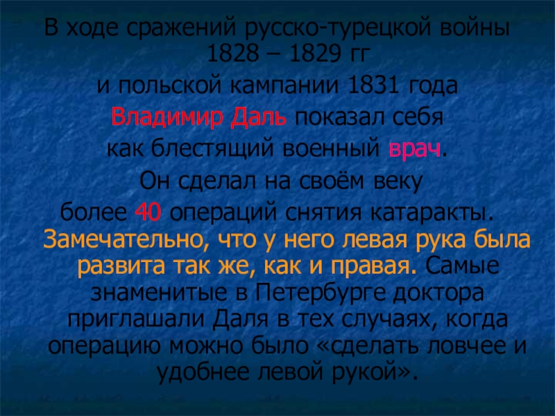 более 40 операций снятия катаракты. Замечательно, что у него левая рука была развита так же, как и правая. Самые знаменитые в Петербурге доктора приглашали Даля в тех случаях, когда операцию можно было «сделать ловчее и удобнее левой рукой».