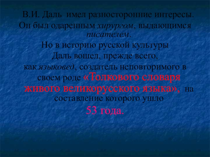 как языковед, создатель неповторимого в своем роде «Толкового словаря живого великорусского языка», на составление которого ушло
