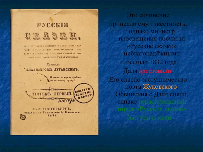 принесло ему известность, однако министр просвещения посчитал «Русские сказки»