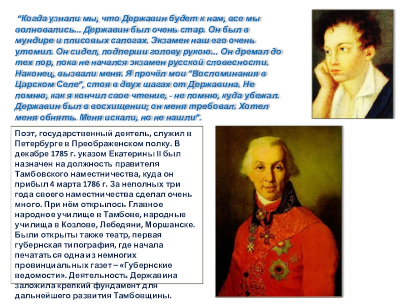 Поэт, государственный деятель, служил в Петербурге в Преображенском полку. В декабре 1785 г. указом Екатерины II был назначен на должность правителя Тамбовского наместничества, куда он прибыл 4 марта 1786 г. За неполных три года своего наместничества сделал очень много. При нём открылось Главное народное училище в Тамбове, народные училища в Козлове, Лебедяни, Моршанске. Были открыты также театр, первая губернская типография, где начала печататься одна из немногих провинциальных газет – «Губернские ведомости». Деятельность Державина заложила крепкий фундамент для дальнейшего развития Тамбовщины.
