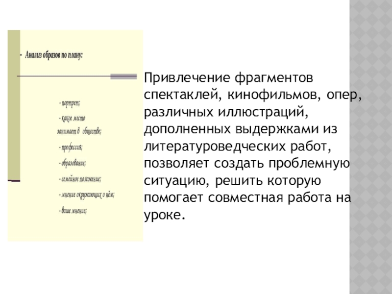 Привлечение фрагментов спектаклей, кинофильмов, опер, различных иллюстраций, дополненных выдержками из литературоведческих работ, позволяет создать проблемную ситуацию, решить