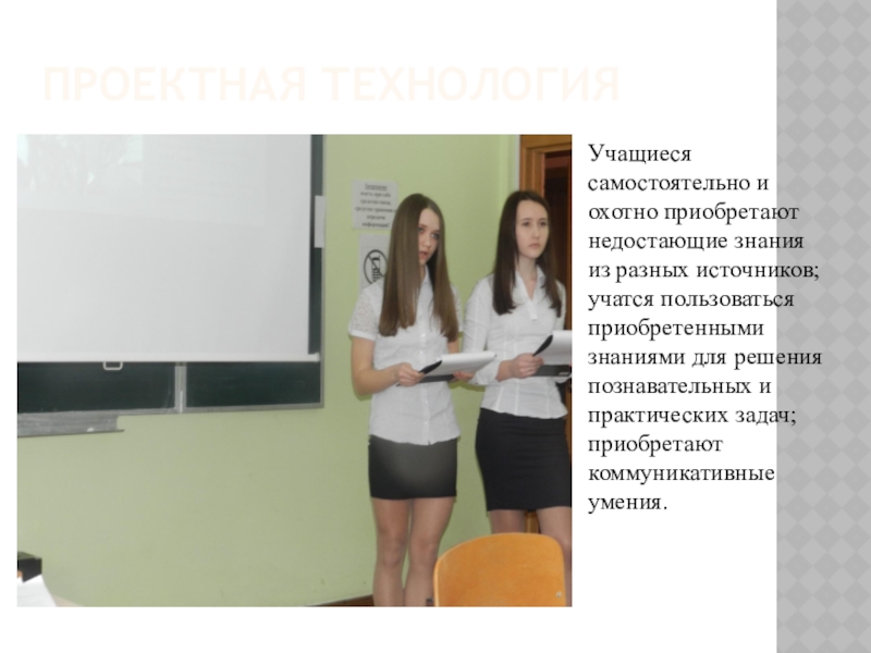 Проектная технологияУчащиеся самостоятельно и охотно приобретают недостающие знания из разных источников; учатся пользоваться приобретенными знаниями для решения