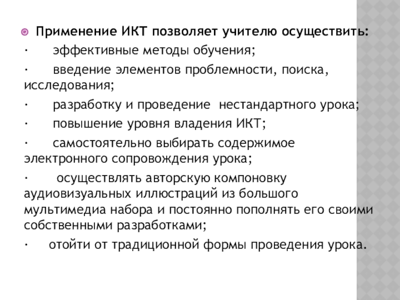 Применение ИКТ позволяет учителю осуществить:·      эффективные методы обучения;·      введение элементов проблемности, поиска, исследования;·      разработку и проведение  нестандартного урока;·      повышение уровня владения