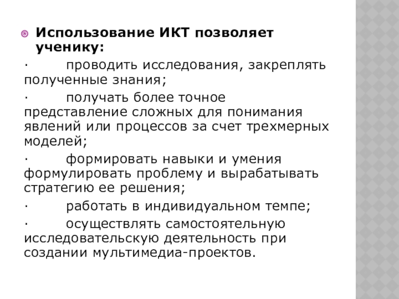 Использование ИКТ позволяет ученику:·        проводить исследования, закреплять полученные знания;·        получать более точное представление сложных для понимания явлений или процессов