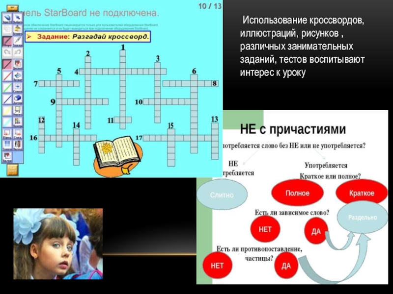 Слайд 6 Использование кроссвордов, иллюстраций, рисунков , различных занимательных заданий, тестов воспитывают