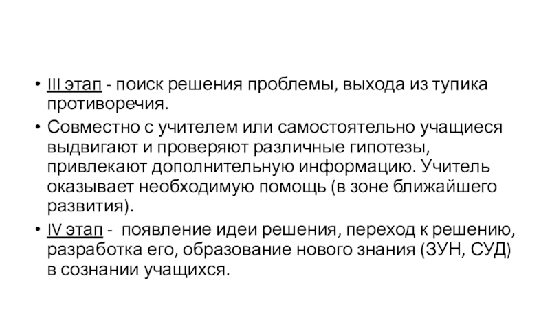 IV этап - появление идеи решения, переход к решению, разработка его, образование нового знания (ЗУН, СУД) в сознании учащихся.
