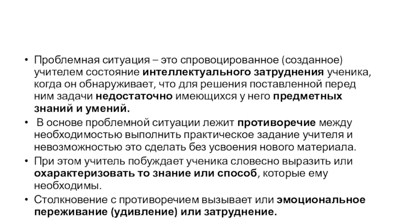 Слайд 9Проблемная ситуация – это спровоцированное (созданное) учителем состояние интеллектуального затруднения ученика,