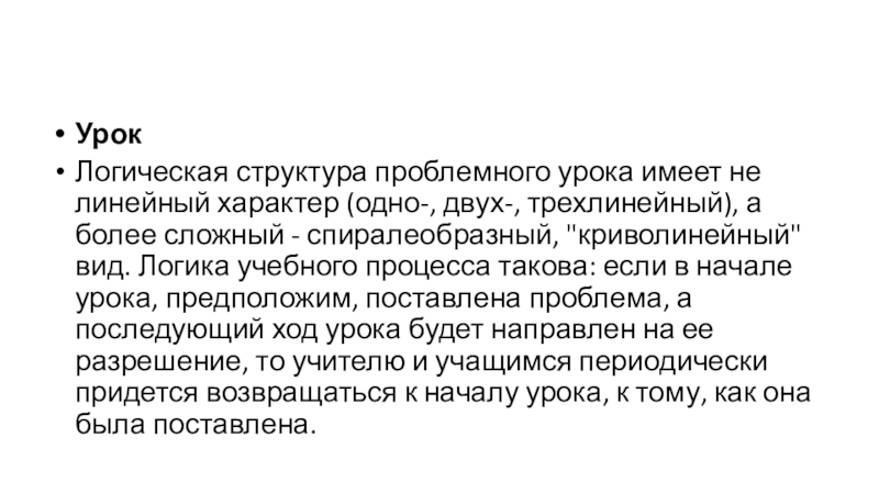а более сложный - спиралеобразный, "криволинейный" вид. Логика учебного процесса такова: если в начале урока, предположим, поставлена проблема, а последующий ход урока будет направлен на ее разрешение, то учителю и учащимся периодически придется возвращаться к началу урока, к тому, как она была поставлена.