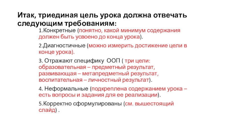 Слайд 5Итак, триединая цель урока должна отвечать следующим требованиям: