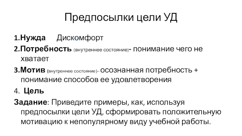 Задание: Приведите примеры, как, используя предпосылки цели УД, сформировать положительную мотивацию к непопулярному виду учебной работы.