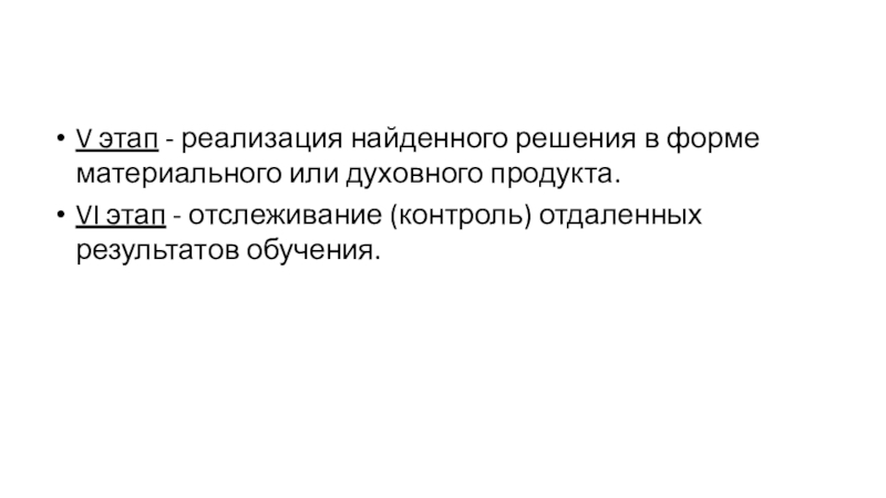 Слайд 15V этап - реализация найденного решения в форме материального или духовного продукта.
