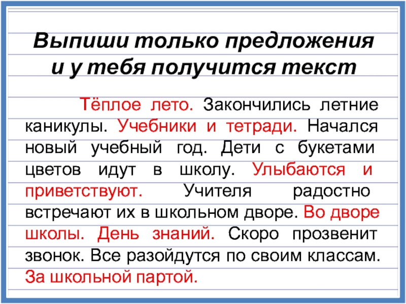 Тёплое лето. Закончились летние каникулы. Учебники и тетради. Начался новый учебный год. Дети с букетами цветов идут в школу. Улыбаются и приветствуют. Учителя радостно встречают их в школьном дворе. Во дворе школы. День знаний. Скоро прозвенит звонок. Все разойдутся по своим классам. За школьной партой.