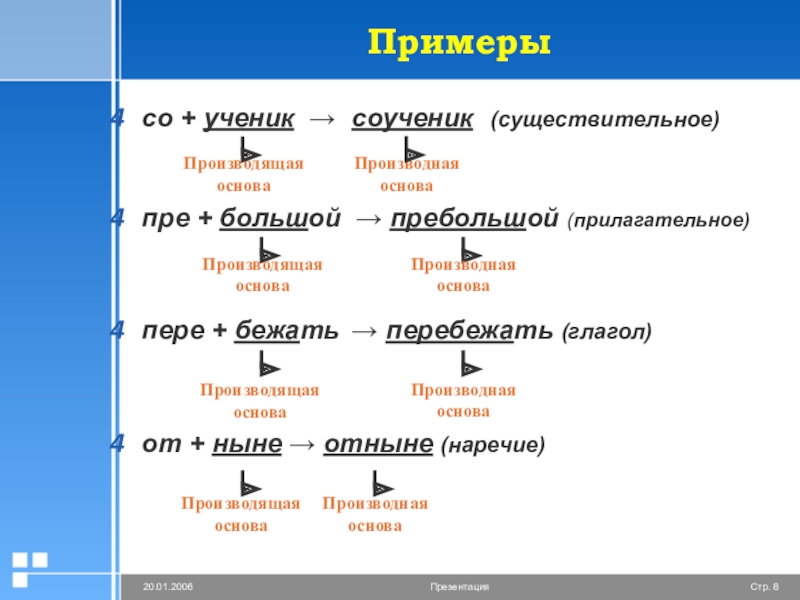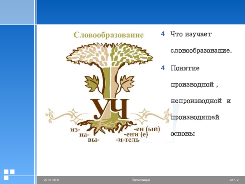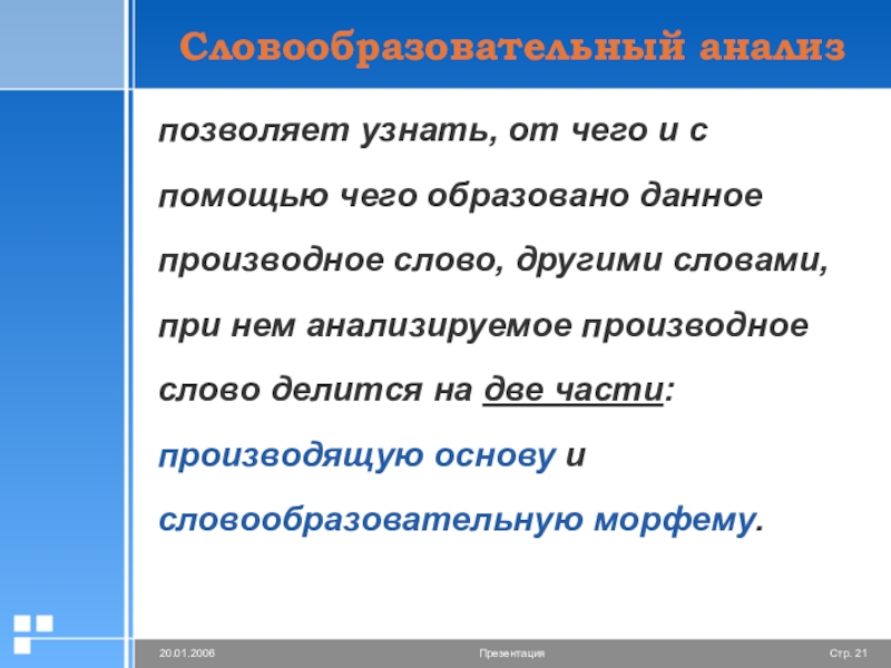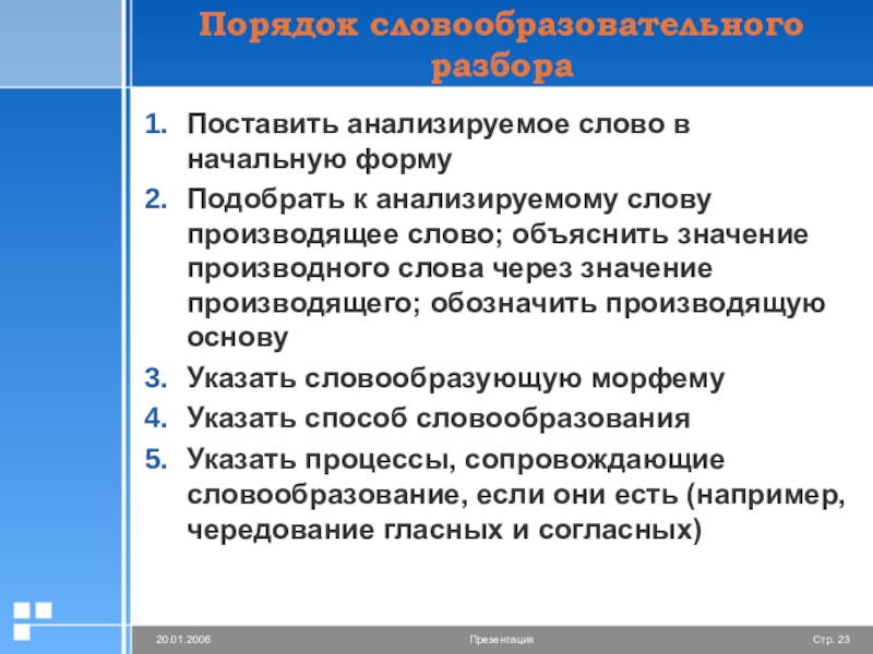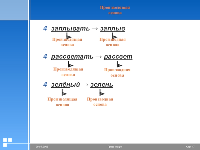 производящее слово; объяснить значение производного слова через значение производящего; обозначить производящую основу