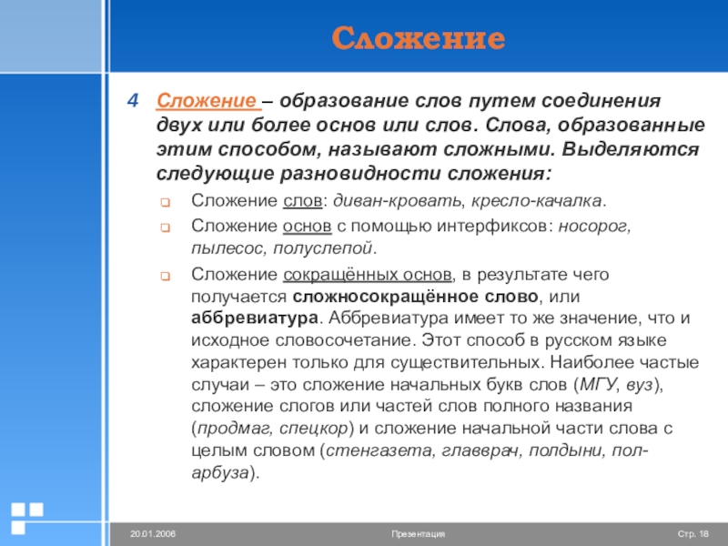 или слов. Слова, образованные этим способом, называют сложными. Выделяются следующие разновидности сложения: