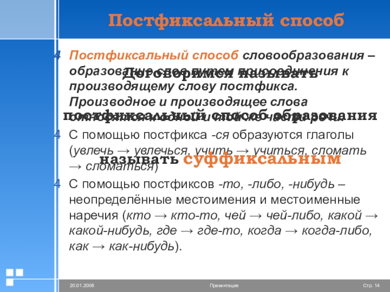Постфиксальный способ словообразования – образование слов путем присоединения к производящему