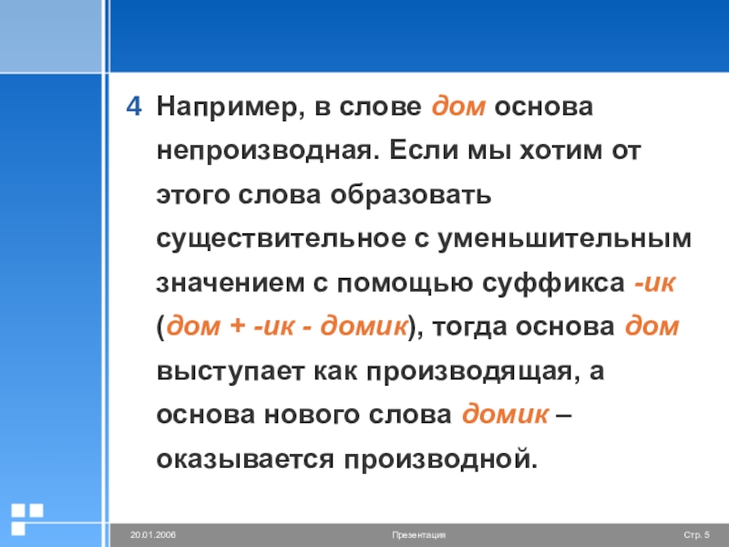 слова образовать существительное с уменьшительным значением с помощью суффикса -ик (дом + -ик - домик), тогда основа дом выступает как производящая, а основа нового слова домик – оказывается производной.