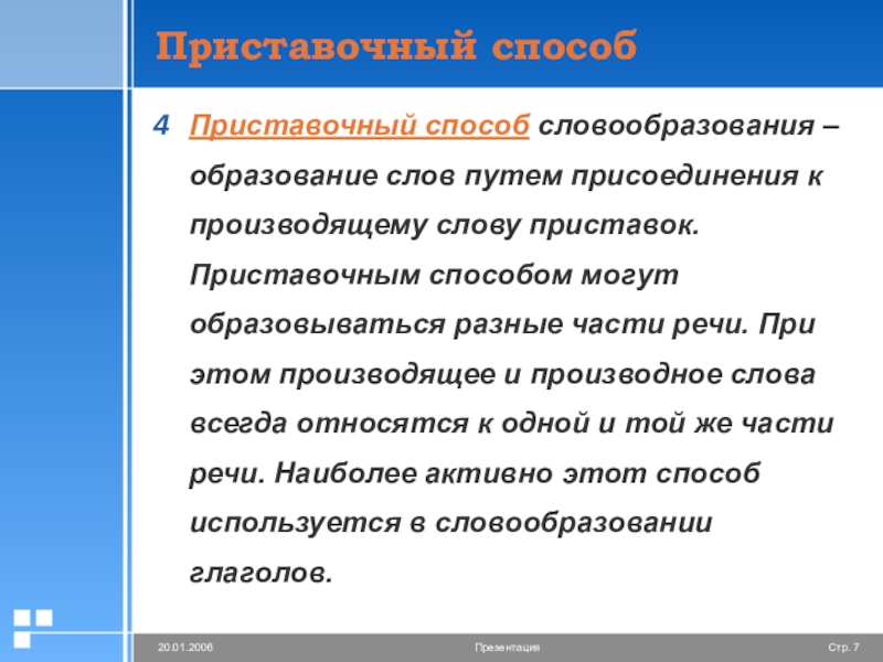 слову приставок. Приставочным способом могут образовываться разные части речи. При этом производящее и производное слова всегда относятся к одной и той же части речи. Наиболее активно этот способ используется в словообразовании глаголов.