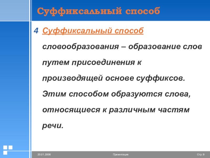 Суффиксальный способ словообразования – образование слов путем присоединения к производящей