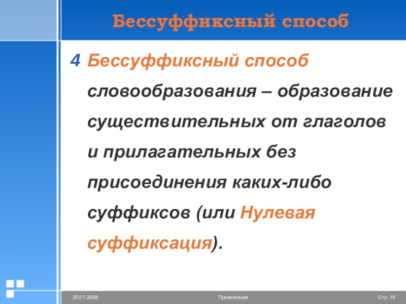 Бессуффиксный способ словообразования – образование существительных от глаголов и прилагательных