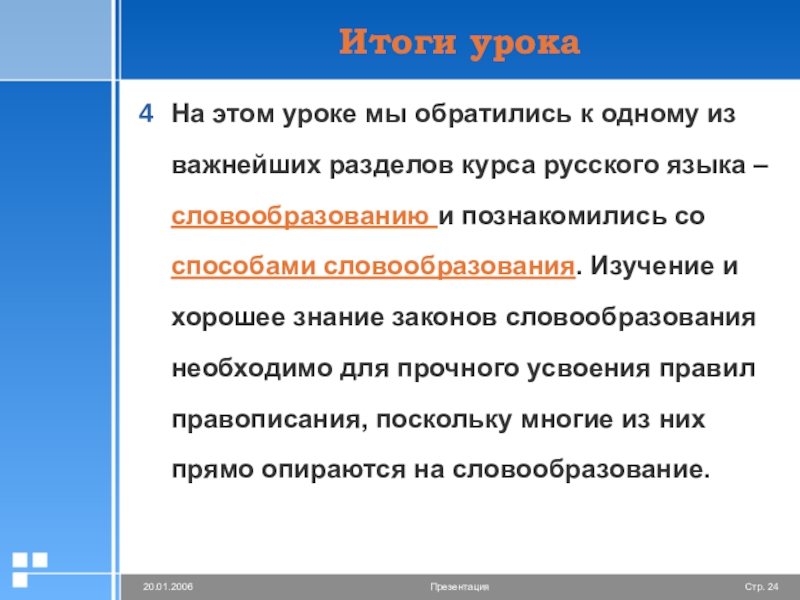 курса русского языка – словообразованию и познакомились со способами словообразования. Изучение и хорошее знание законов словообразования необходимо для прочного усвоения правил правописания, поскольку многие из них прямо опираются на словообразование.