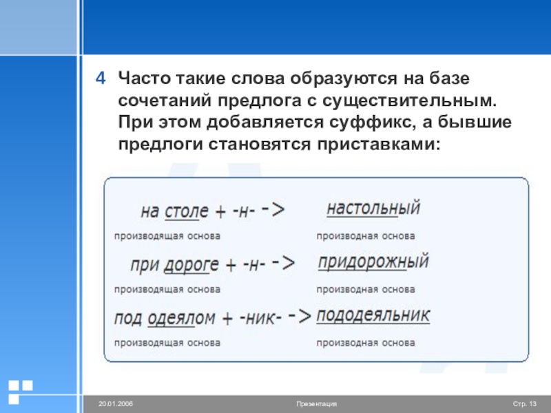 этом добавляется суффикс, а бывшие предлоги становятся приставками:
