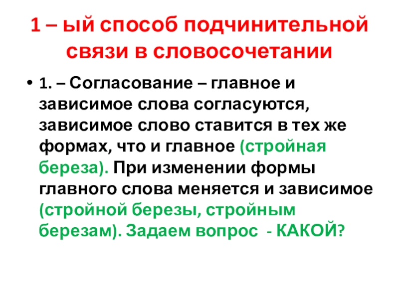 главное и зависимое слова согласуются, зависимое слово ставится в тех же формах, что и главное (стройная береза). При изменении формы главного слова меняется и зависимое (стройной березы, стройным березам). Задаем вопрос - КАКОЙ?