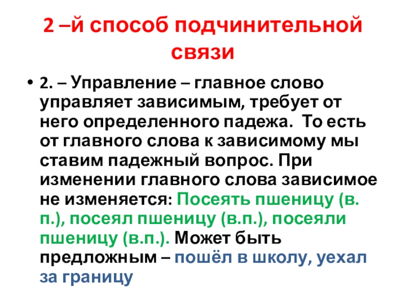зависимым, требует от него определенного падежа. То есть от главного слова к зависимому мы ставим падежный вопрос. При изменении главного слова зависимое не изменяется: Посеять пшеницу (в.п.), посеял пшеницу (в.п.), посеяли пшеницу (в.п.). Может быть предложным – пошёл в школу, уехал за границу