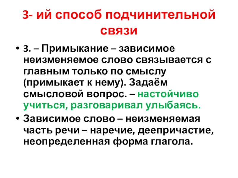 Зависимое слово – неизменяемая часть речи – наречие, деепричастие, неопределенная форма глагола.