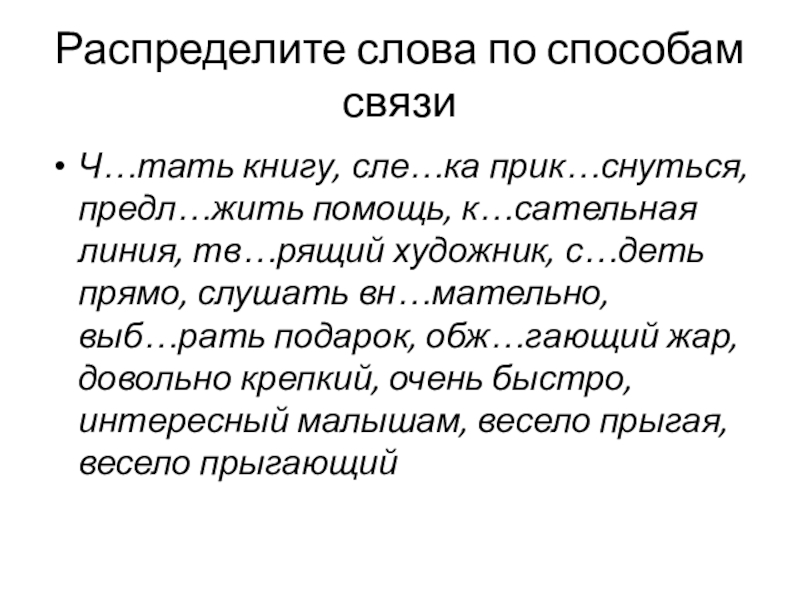 линия, тв…рящий художник, с…деть прямо, слушать вн…мательно, выб…рать подарок, обж…гающий жар, довольно крепкий, очень быстро, интересный малышам, весело прыгая, весело прыгающий