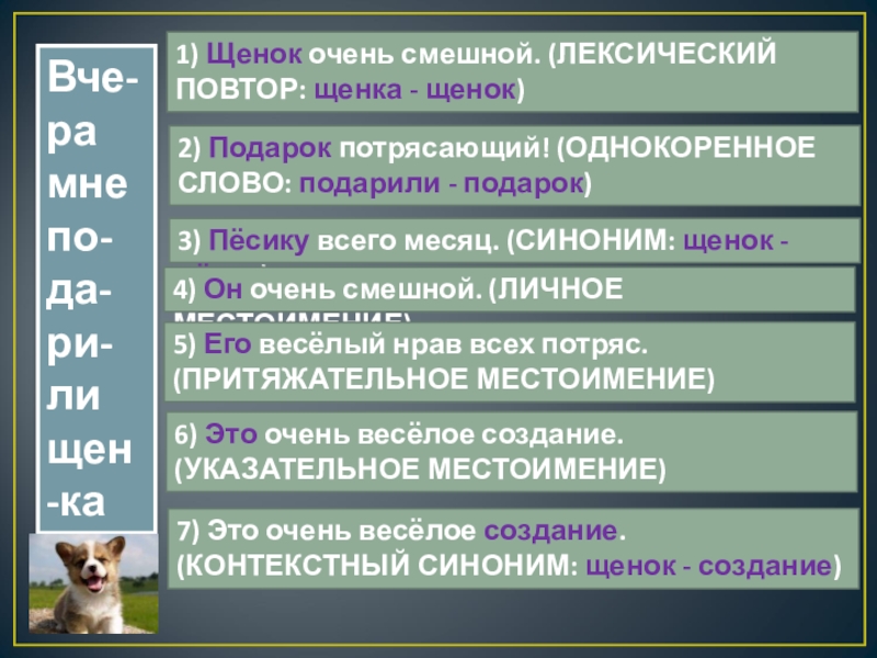 7) Это очень весёлое создание. (КОНТЕКСТНЫЙ СИНОНИМ: щенок - создание)
