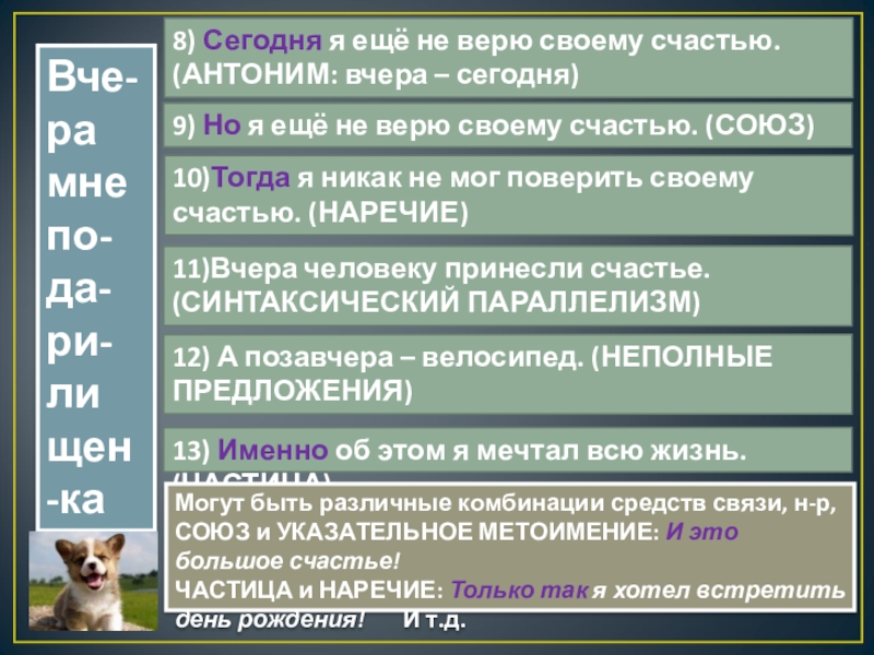 11)Вчера человеку принесли счастье. (СИНТАКСИЧЕСКИЙ ПАРАЛЛЕЛИЗМ)