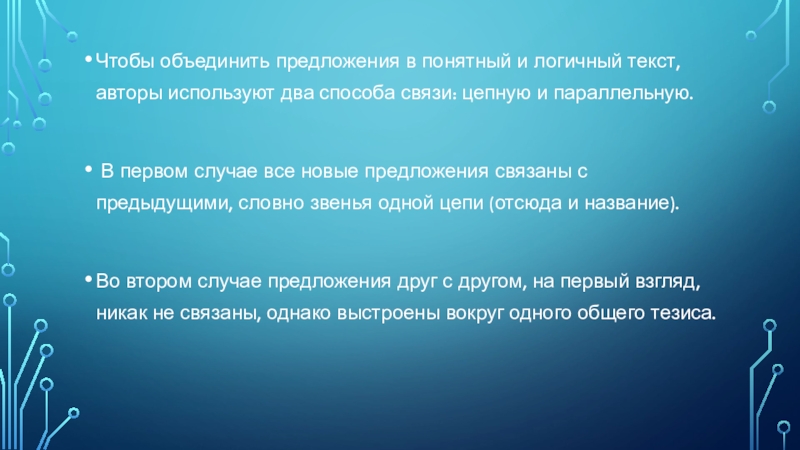 Слайд 4Чтобы объединить предложения в понятный и логичный текст, авторы используют два
